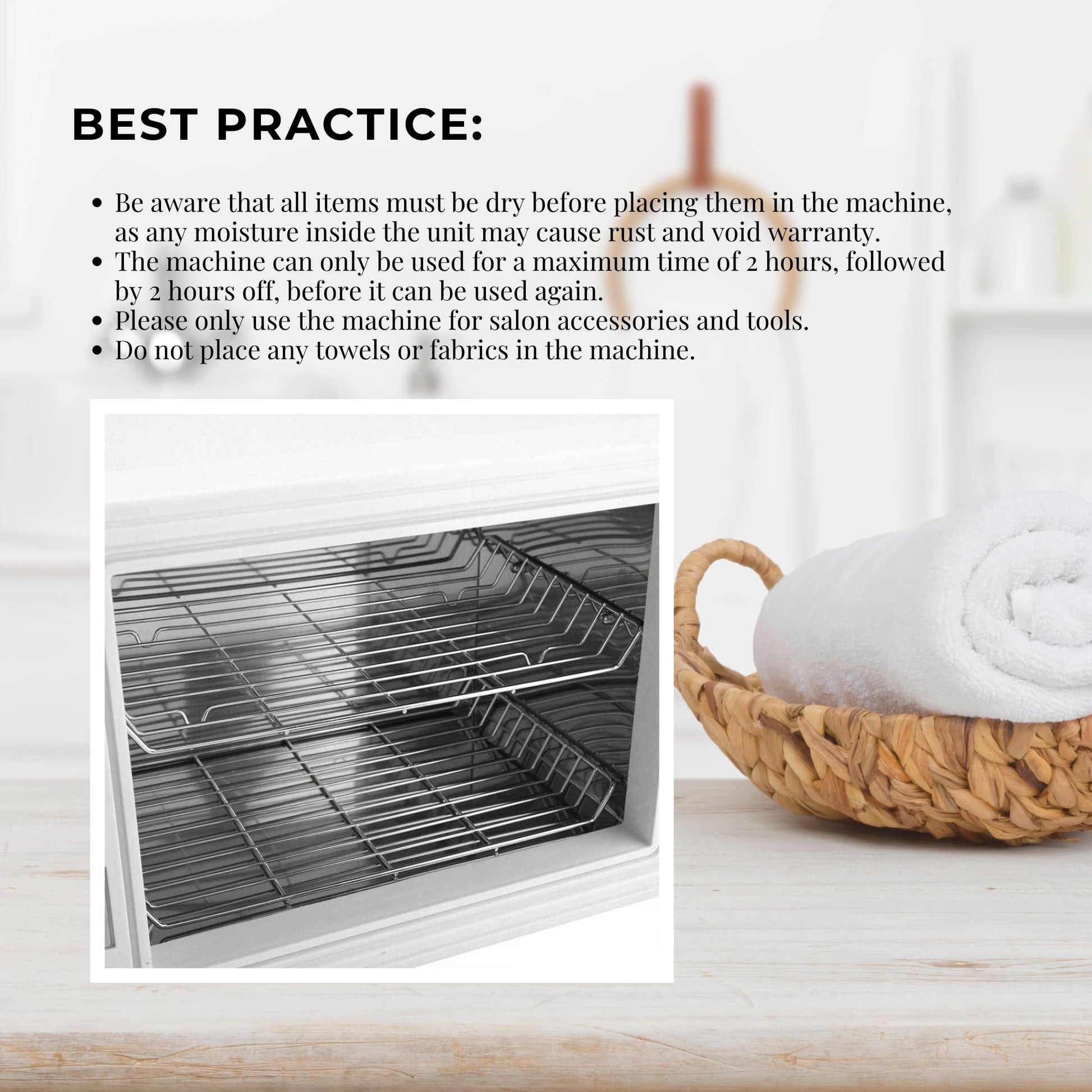 Ensure all tools are completely dry before use. The unit is intended for non-porous salon accessories and tools only - not for towels, fabrics, or liquids. Operate for up to 2 hours at a time, then allow at least 2 hours to cool before reuse. Keep the device in a well-ventilated area during operation.