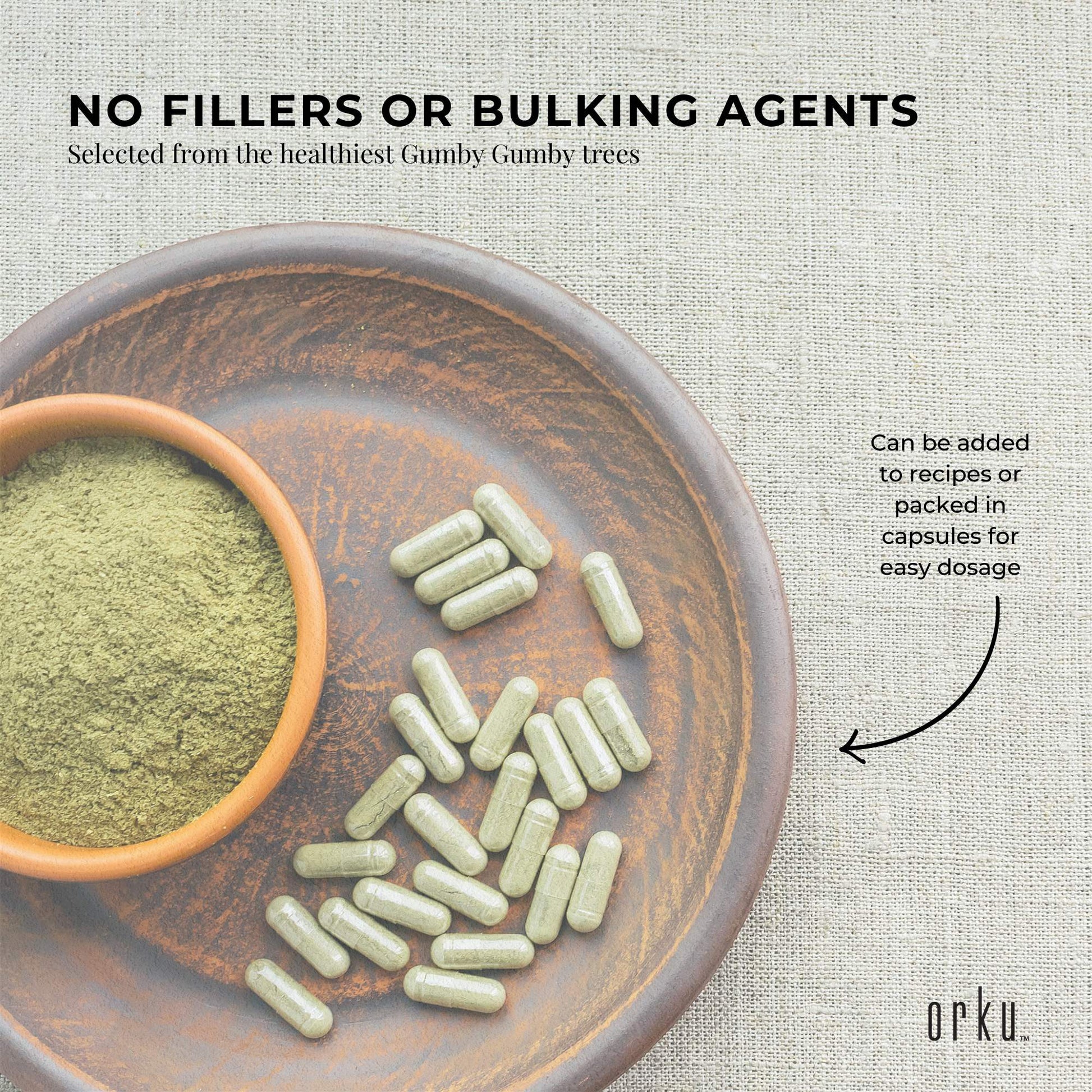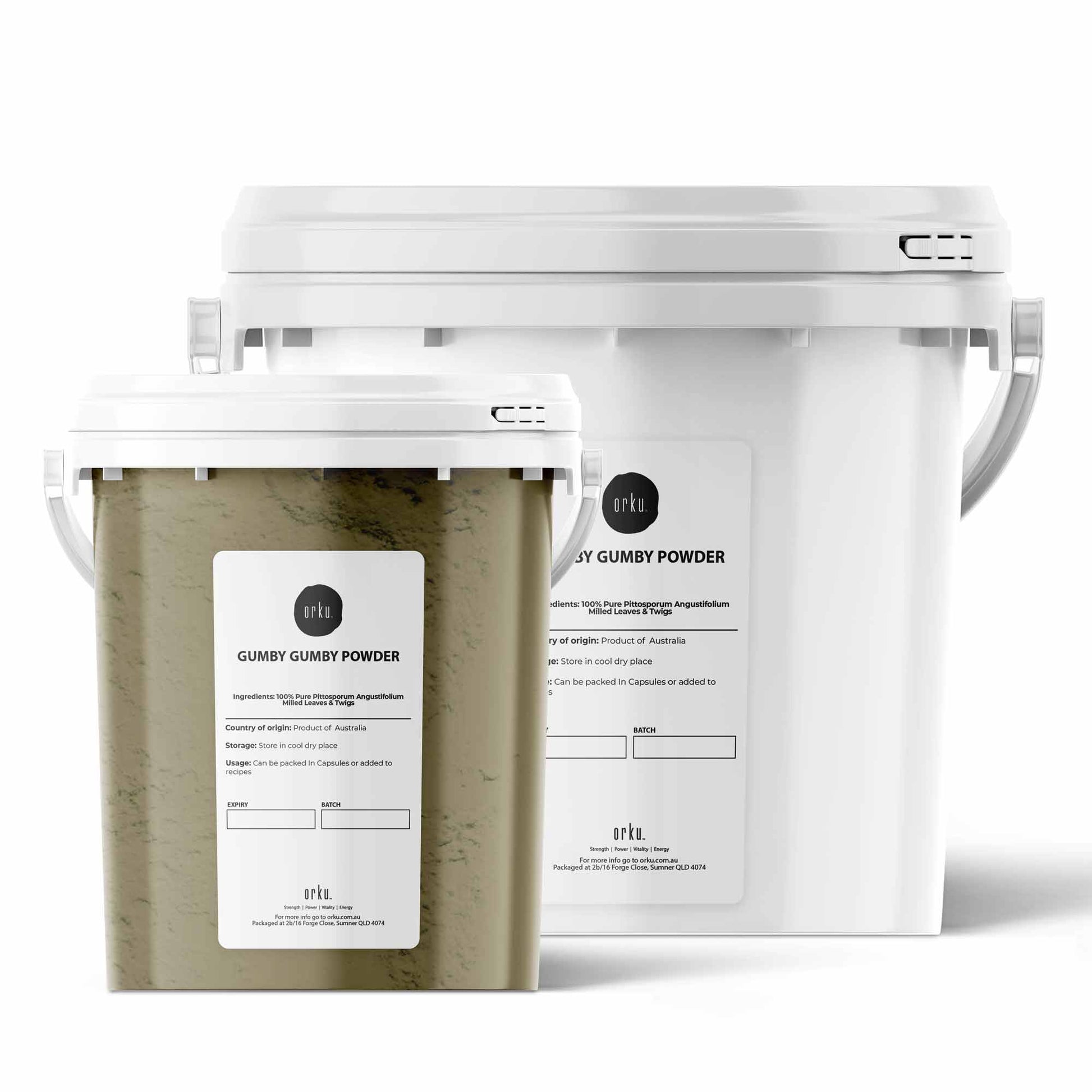 Orku Gumby Gumby (Pittosporum Angustifolium) powder is made from hand-selected leaves and green twigs of only the youngest shoots of healthy trees. The plant material is gently washed, dried in a UV-protected shed, and milled to preserve its natural characteristics.