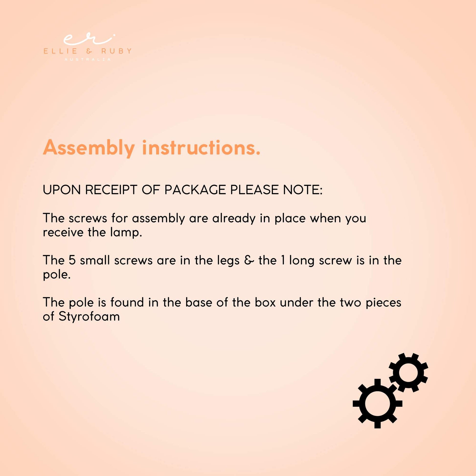 UPON RECEIPT OF PACKAGE PLEASE NOTE: THE SCREWS FOR ASSEMBLY ARE ALREADY IN PLACE WHEN RECEIVED. The 5 small screws are in the legs & the 1 long screw is in the pole. The pole is found in the base of the box under the two pieces of Styrofoam