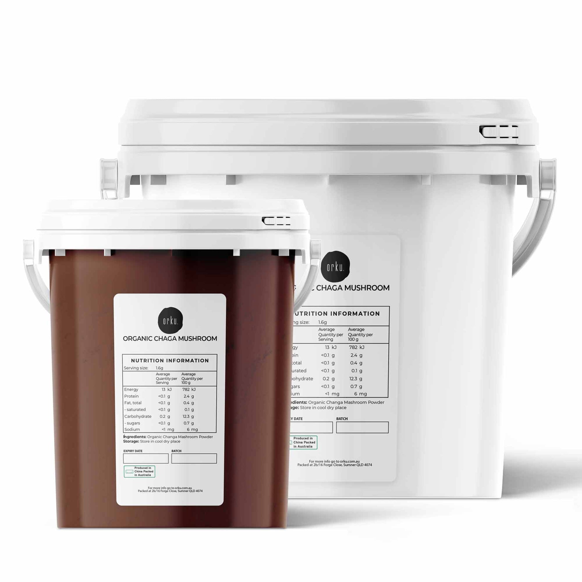 - Organic Chaga Mushroom Powder in resealable bucket.
