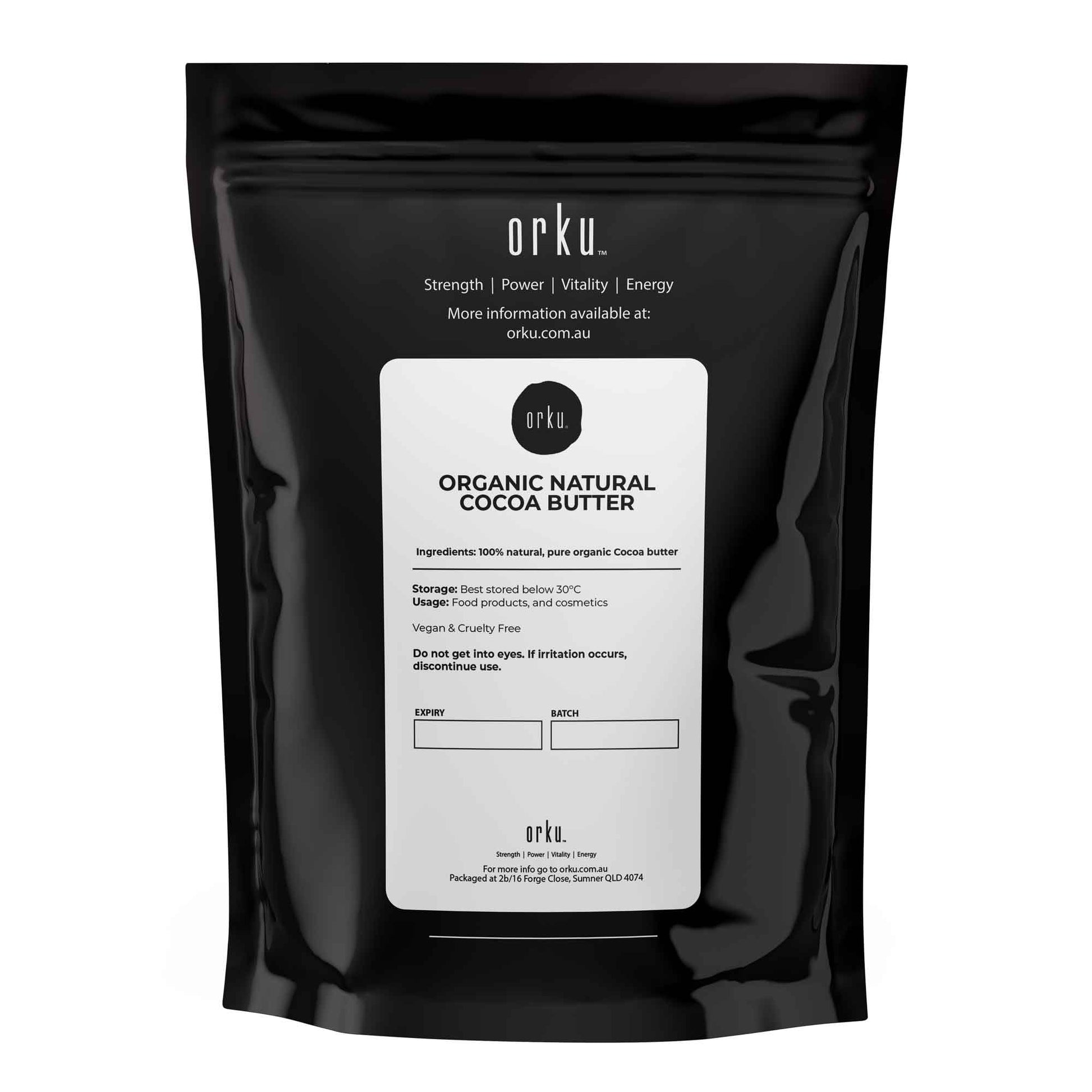 Orku natural organic Cocoa butter is produced using high quality whole cocoa beans from the pods that grows on the cacao tree. The Cocoa beans are fermented, roasted and then separated from their hulls. About 54–58% of the residue is butter. Our Cocoa butter is food grade.