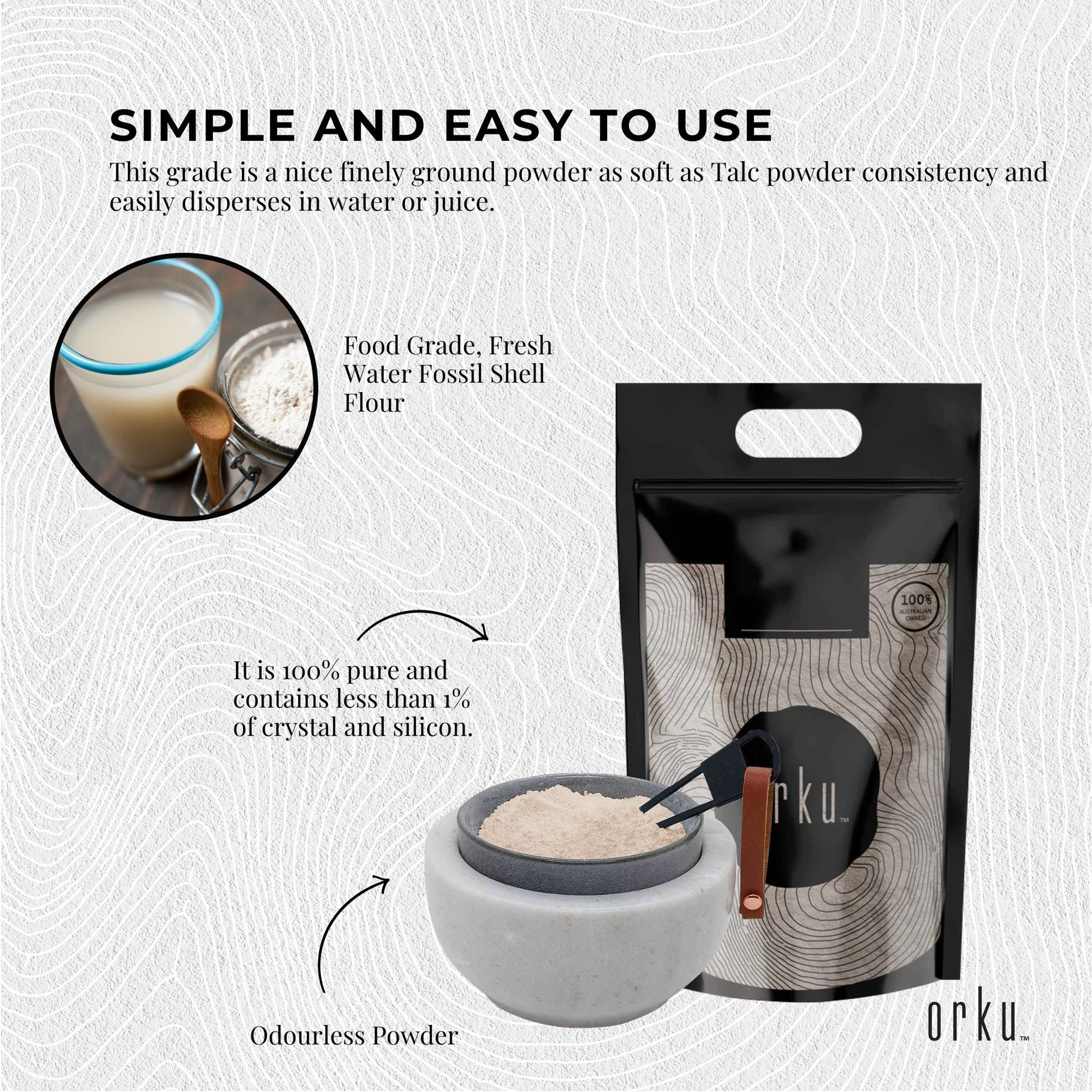 Ultra Fine Organic Food Grade Diatomaceous Earth is a superior off white powder, sterilised for consuming by heat treating via sunshine or UV light - enough to kill bacteria and pathogens but not harm the Diatomaceous Earth. It is 100% pure and contains less than 1% of crystal and silicon. Particle size is approximately 20 UM.