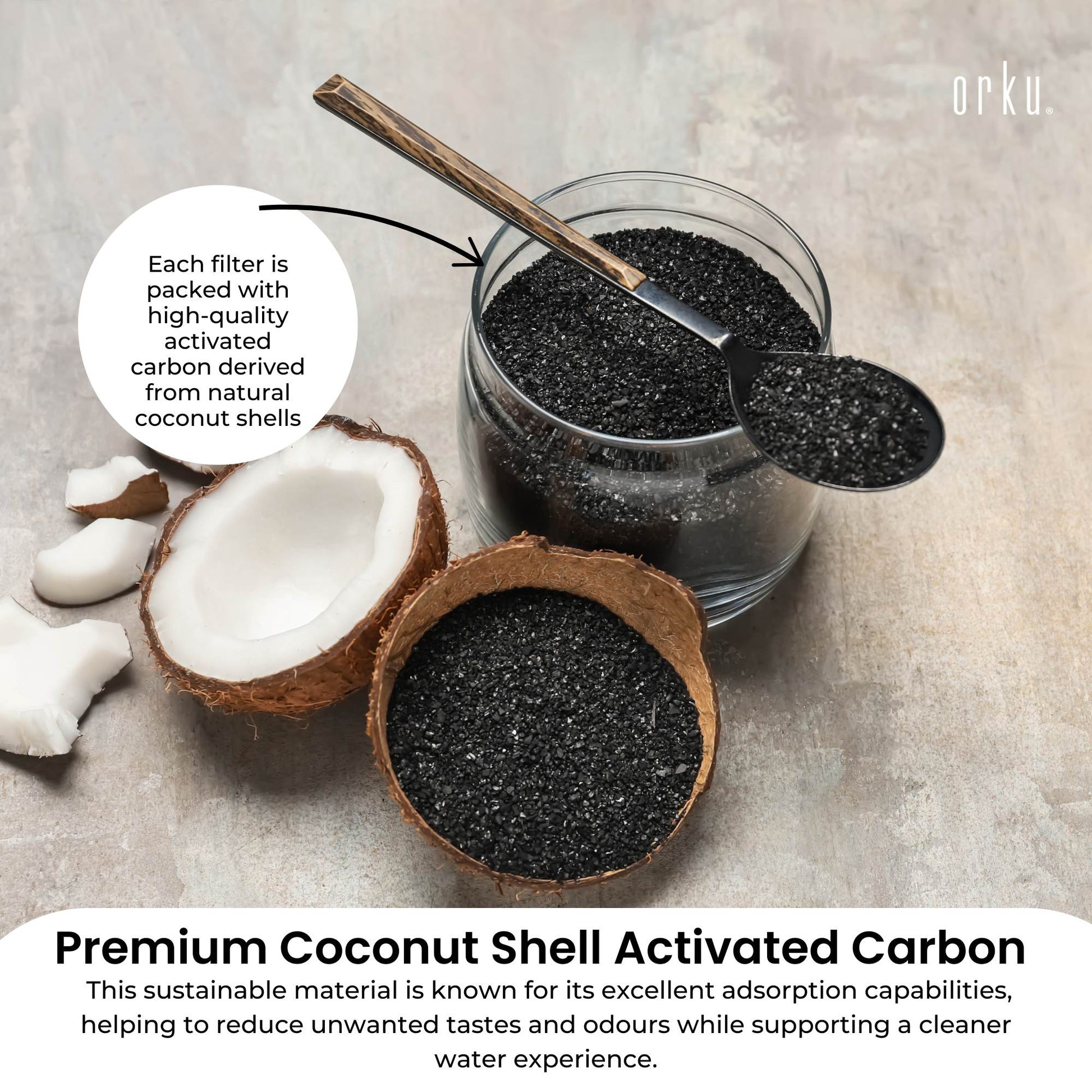 - Premium Coconut Shell Activated Carbon: Each filter is packed with high-quality activated carbon derived from natural coconut shells. This sustainable material is known for its excellent adsorption capabilities, helping to reduce unwanted tastes and odours while supporting a cleaner water experience.